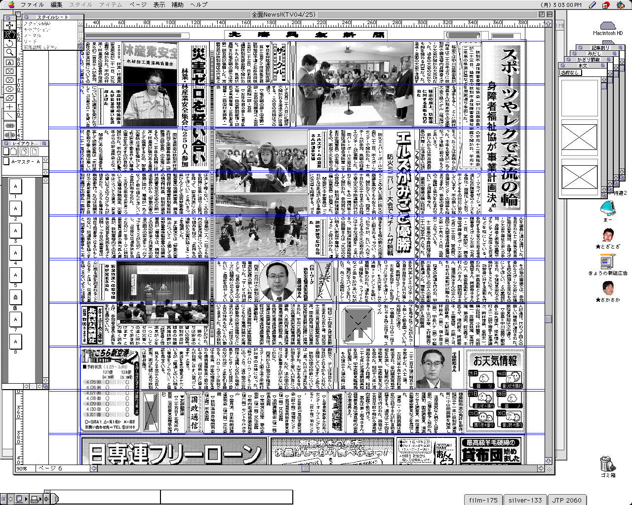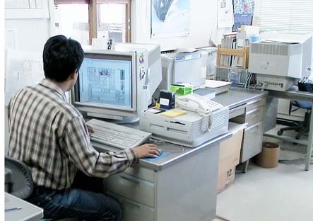 現在、弊社では入稿される記事原稿、写真、広告すべてがデジタルデータとなっており、二人のDTPオペレーターが多様なデータや記事を総合的にデザイン、レイアウトして新聞紙面を作ります。この部署は、デジタル・アナログ入力からイメージセッターへの出力に至るまで、一連の幅広い知識と技術力を要します。まさにプロ中のプロ、DTP(デスク・トップ・パブリッシング)の最先端と言っても過言ではありません。 |